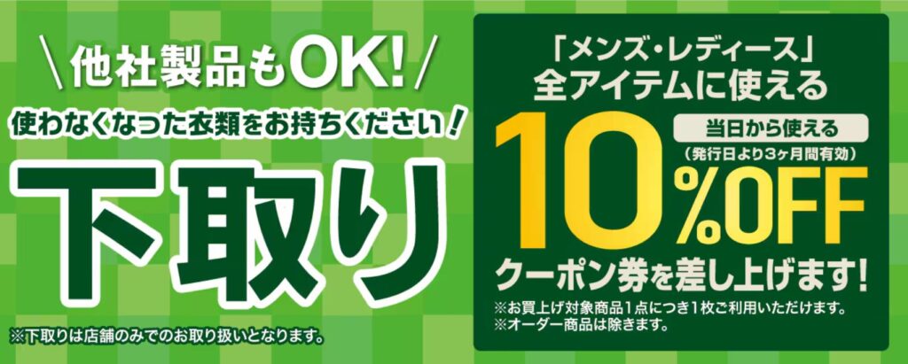 洋服の青山を語る上で絶対に外せないのが、伝統的な「下取りキャンペーン(Shitadori)」です。これは、もう履かなくなった古い革靴(他社製でもOK!)を店舗に持ち込むと、新しい商品を買う際に使える割引チケットと交換してくれる仕組み。