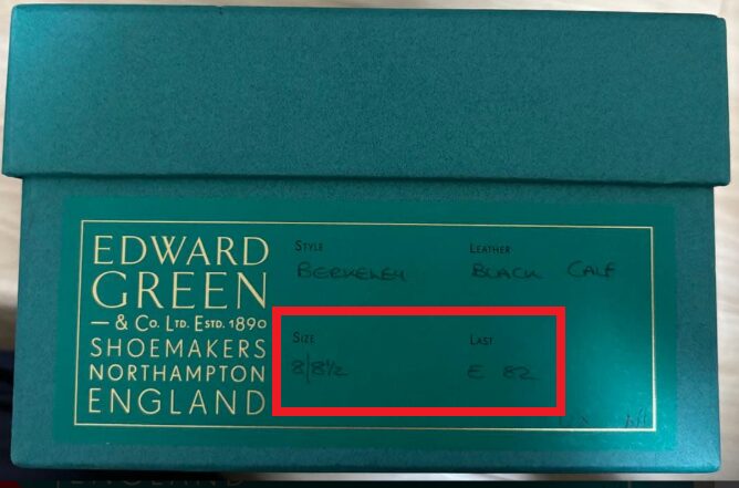 次に重要なのが「ラスト(木型)」の番号です。エドワードグリーンには数多くのラストが存在しますが、箱のラベルにどの番号が書かれているかで、その靴の性格だけでなく、おおよその製造時期も分かります。