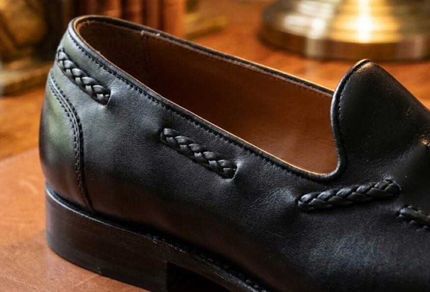 視覚的な効果も絶大です。スムースカーフの滑らかな表面に対し、この編み込みが加わることで、靴全体に工芸品のような奥行きとリズムが生まれます。
