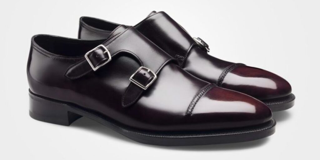 一見するとキャップトゥやバックルの台座パーツが縫い付けられているように見えますが、実はこれ、一枚の革を内側からつまんで縫う「スキンステッチ」などの技法を駆使して、パーツがあるように「見せている」だけなんです。実際には一枚の滑らかな革。この「視覚のトリック」には、多くの靴愛好家が膝を打ちました。