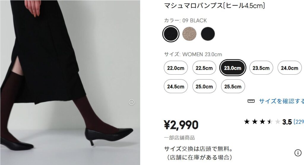 また、最近ではGUでも「オフィスカジュアル」に適したローファーやフラットシューズも展開されていますが、正社員の面接ならやはり適度なヒールのあるパンプスが、背筋が伸びて印象が良くなります。自分に合ったサイズを見つけるために、ストッキングを履いた状態で試着することもお忘れなく。